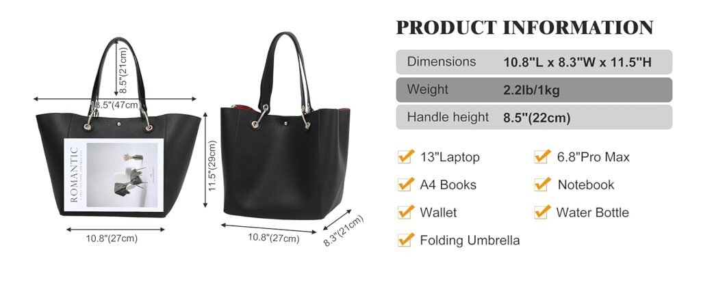 Measuring 9.5″L x 10.5″W x 11.5″H and weighing just 2.31 lbs, this tote offers substantial capacity without overwhelming your frame. The dimensions comfortably accommodate A4 folders and laptops while remaining manageable on crowded public transportation.